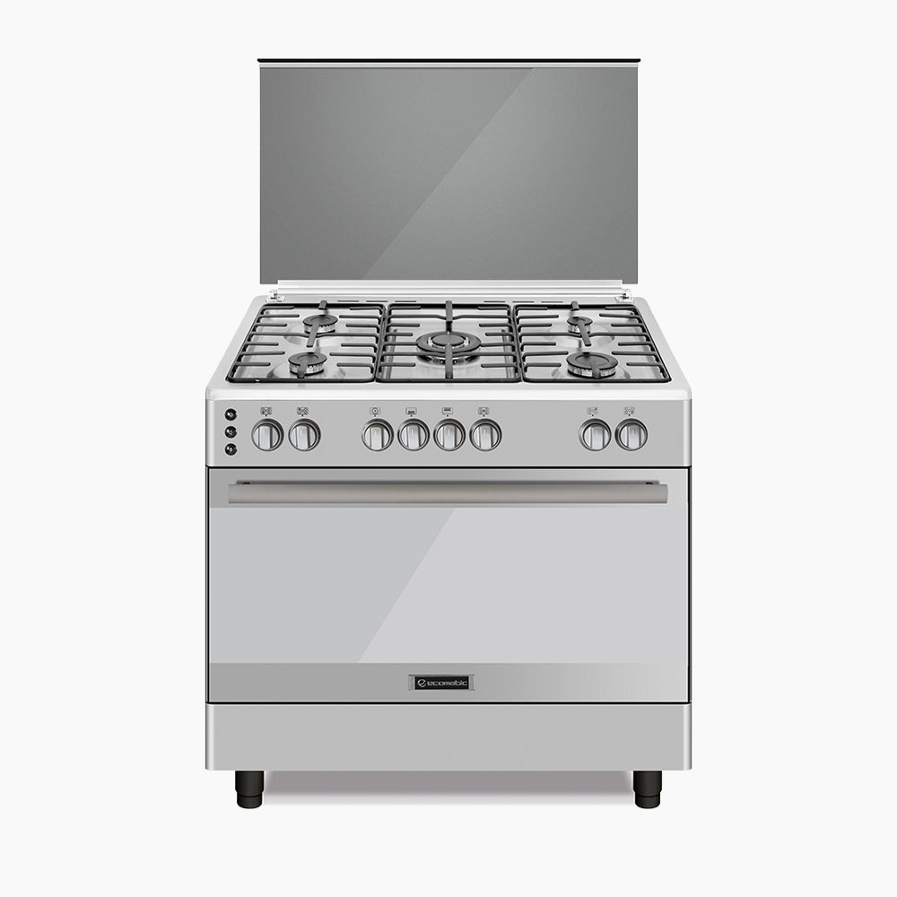 المسطح إستانلس ستيل 90 سم 5 شعلة غاز - إشعال ذاتي - أمان كامل إيطالي -حوامل مط زهر عريضة - شعلة ثلاثية SABAF إيطالي - غطاء زجاجي.