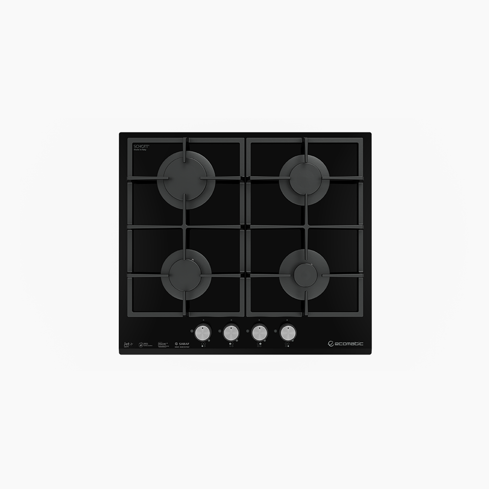 مسطح إيكوماتك 60 سم كريستال أسود بتصميم مربع أنيق يمنح مطبخك لمسة عصرية مميزة. مزوّد بـ 4 شعلات SABAF إيطالية عالية الجودة، مع إشعال أوتوماتيك ونظام أمان كامل إيطالي ليضمن لك استخدامًا آمنًا وموثوقًا. السطح مصنوع من زجاج SCHOTT الألماني بسمك 8 مم، المعروف بقوته ومقاومته للحرارة والصدمات.