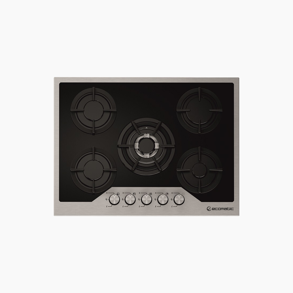 مسطح إيكوماتك 70 سم بيجمع بين اللمسة الراقية للكريستال الأسود وقوة الستانلس ستيل في تصميم واحد أنيق وسهل التنظيف. بخمس شعلات عالية الكفاءة، منها شعلة ثلاثية SABAF إيطالية بقدرة 3.8KW تمنحك لهب قوي ودقيق، مع سطح زجاج ألماني SCHOTT المعروف بتحمله وفخامته.