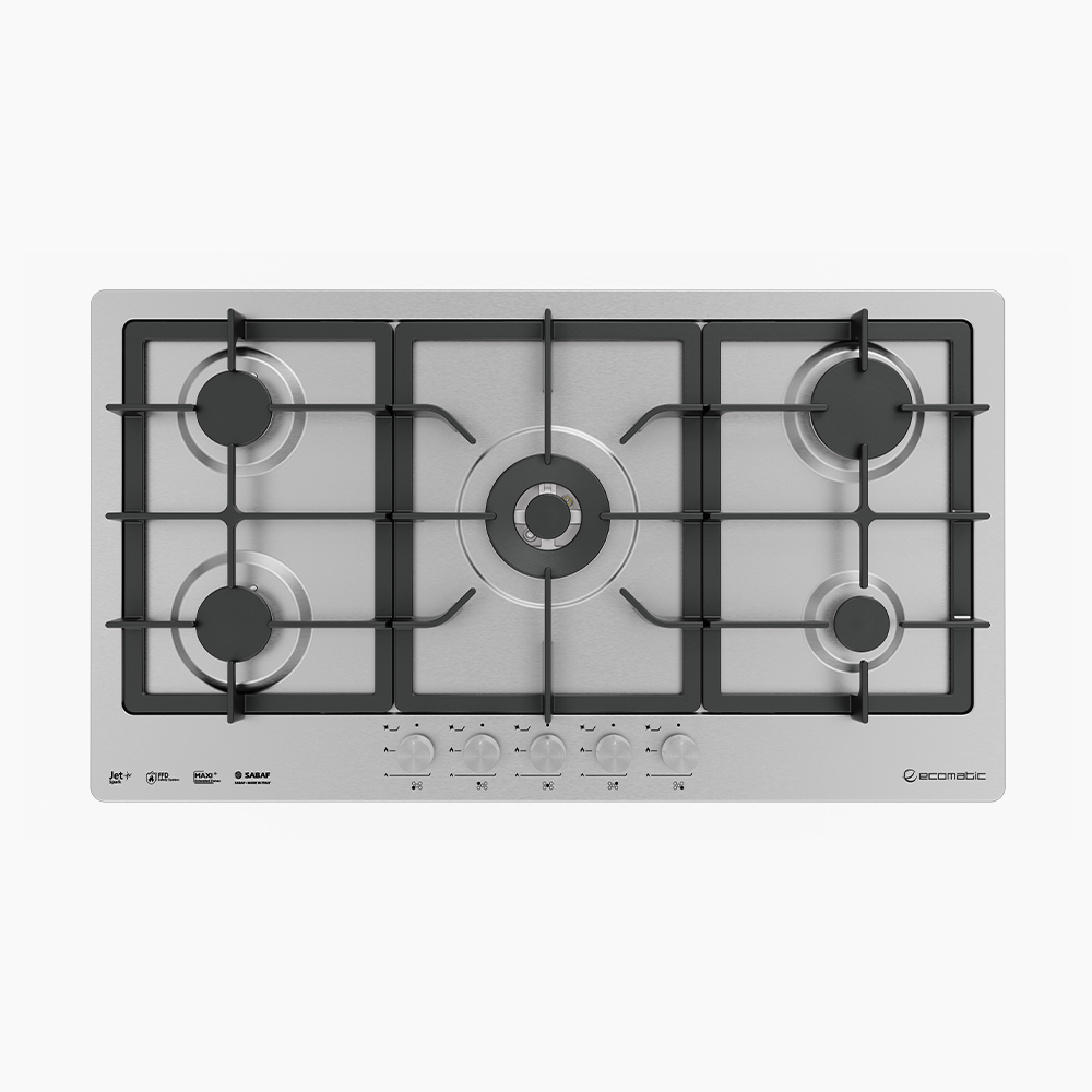 مسطح إيكوماتك بلت إن غاز 92 سم بتصميم عصري من الستانلس ستيل اللامع، مزوّد بـ 5 شعلات XL تمنحك مساحة طهي واسعة وأداء قوي يناسب الاستخدام اليومي. تصميم أنيق وجودة إيطالية تكمّل مطبخك العصري.