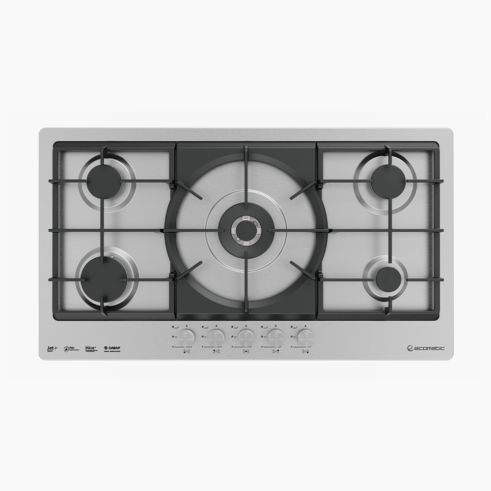 مسطح إيكوماتك بلت إن غاز 92 سم بتصميم ستانلس ستيل أنيق، مزوّد بـ 5 شعلات XL تمنحك مساحة مريحة وحرارة قوية تناسب كل وصفاتك. يجمع بين الأداء الإيطالي القوي والمظهر العصري اللامع.