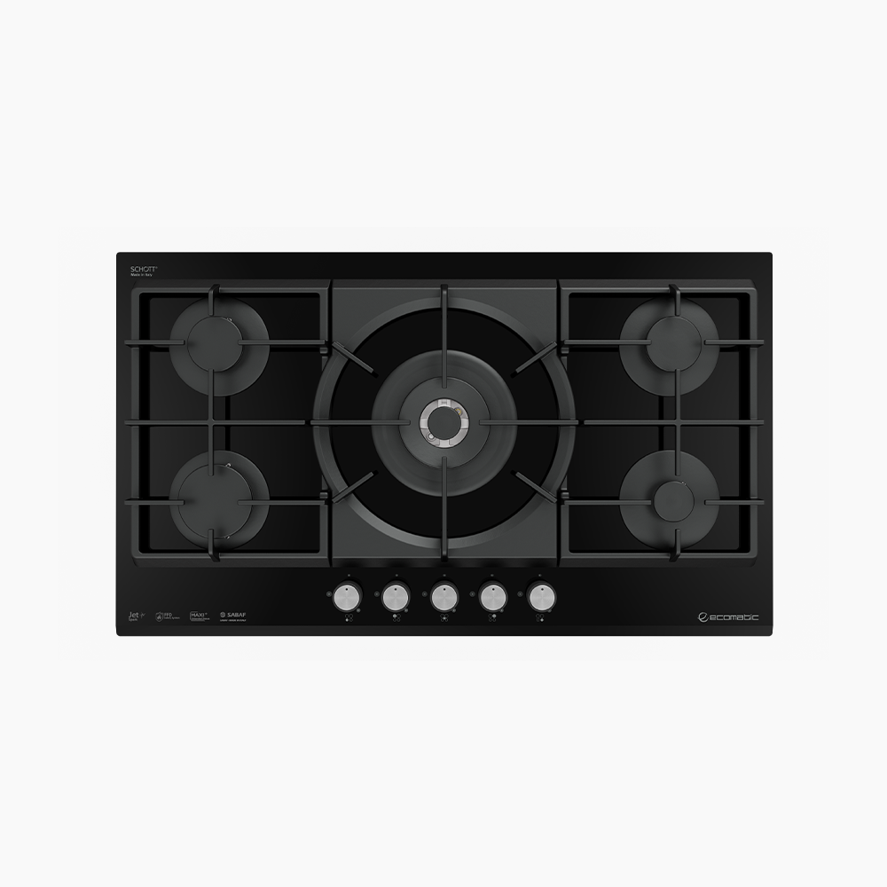 مسطح إيكوماتك بلت إن غاز 92 سم، تصميم كريستال أسود أنيق مع 5 شعلات XL عشان تلاقي الراحة والعملية في مطبخك. بيجمعلك بين الأمان الإيطالي والجودة الأوروبية، بضمان 10 سنين كامل.